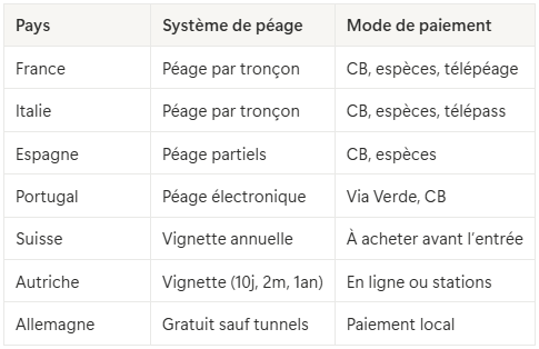 Bon à savoir : Les tunnels alpins (Mont-Blanc, Fréjus, etc.) sont souvent payants même si l’autoroute est gratuite.