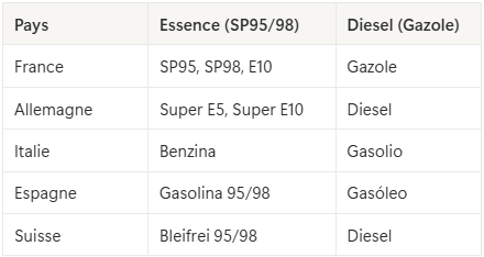 Les carburants disponibles varient peu, mais les appellations et les prix peuvent changer d’un pays à l’autre.